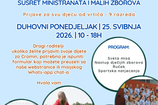 Dragi roditelji i djeco, s radošću vas pozivamo na susret ministranata i malih zborova – CROMIN Datum: 25. svibnja 2026. (Duhovni ponedjeljak) Vrijeme: 10:00 – […]